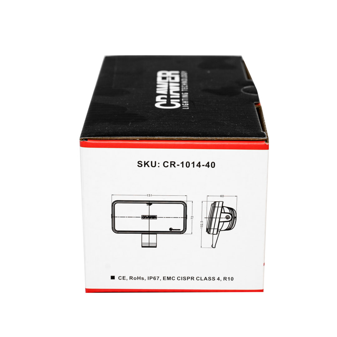 De CR-1014-40 is opgebouwd voor dagelijks gebruik in de landbouw. De aluminium behuizing en stevige afwerking maken de lamp bestand tegen trillingen, vuil en vocht zoals je die tegenkomt op het erf en in het veld. Dankzij de IP67-classificatie is de lamp volledig stof- en waterdicht, waardoor hij ook onder natte omstandigheden betrouwbaar blijft functioneren.