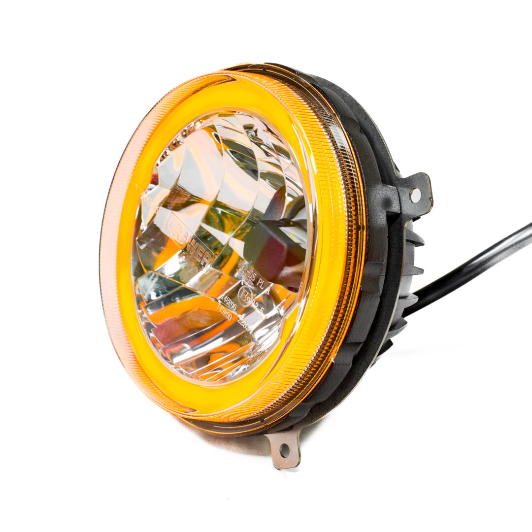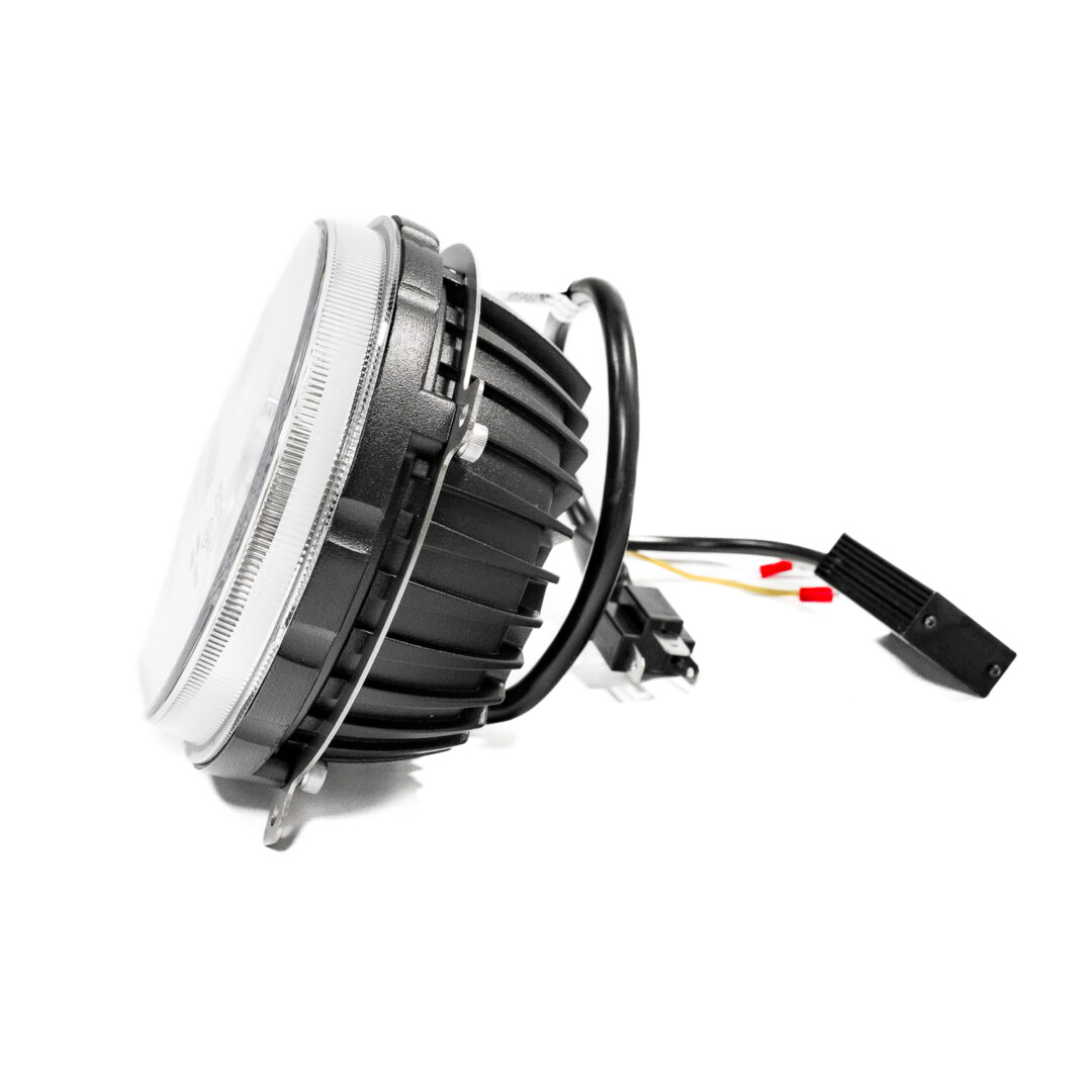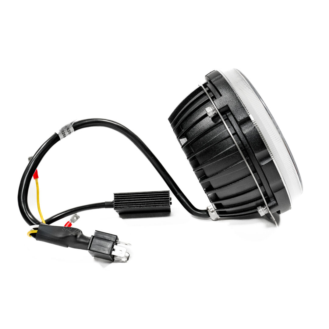 De aansluiting verloopt via een H4-connector met flatspade, waardoor montage overzichtelijk blijft. De positieverlichting (angel eyes of HALO – ring) is beschikbaar in wit en amber, wat extra een mooie extra dimensie geeft aan je koplampen.