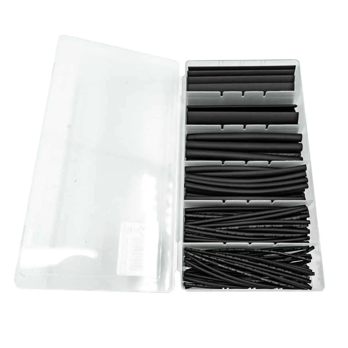 Deze set bevat 100 krimpkousen in verschillende lengtes en wordt geleverd in een handige bewaardoos.